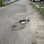厚木市戸田2514付近、エスイー・白銅の敷地と鴻池運輸の敷地との間の道路で、エスイーの敷地と白銅の敷地との境目付近に穴があいています。日に日に穴が大きくなっているようであり、現在深さは6cm程度あります。道路の穴埋め補修のご相談を申し上げます。